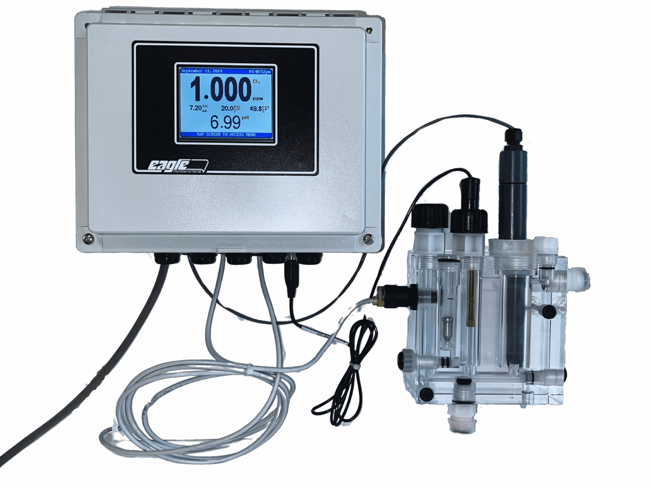 A high-resolution touchscreen display makes it easy to configure, calibrate, and monitor chlorine and pH readings in real time. Operators can view live data and access setup menus directly from the front panel.